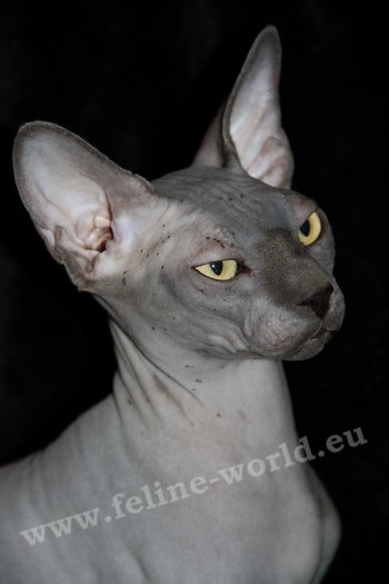| CARACTERISTICS | Medium sized cat. The body is closed with a round musculature. The weight ranges from 3.5 kg to 7 kg This cat appears naked though he does is not completely. All colors are allowed in this breed of cats and their skin takes on the color of hair they would have. White parrait pink and black parrait dark gray. The eyes are large and spaced lemon-shaped. Their color is consistent with that of the dress. |